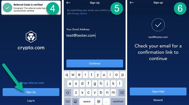 Once the referral code is verified, it’s time to sign up for your account. Enter your email address and hit Continue. Once crypto.com has established a unique email address has been used it will send you a confirmation link. Just head over to your mobile mail account and click on the link to open the new crypto.com account application.