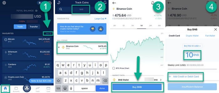 From the home page, select “See All”. Then search for BNB. When the Binance Coin BNB appears, select that link to view the data for BNB. Enter the amount of BNB that you would like to purchase and hit the Buy BNB button. Finally, click Add Credit or Debit Card to add your account. If it allows the card to be added you should be good to go. Your card info will be saved for future use.