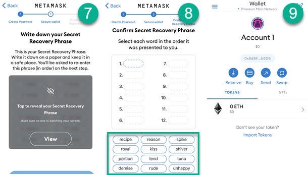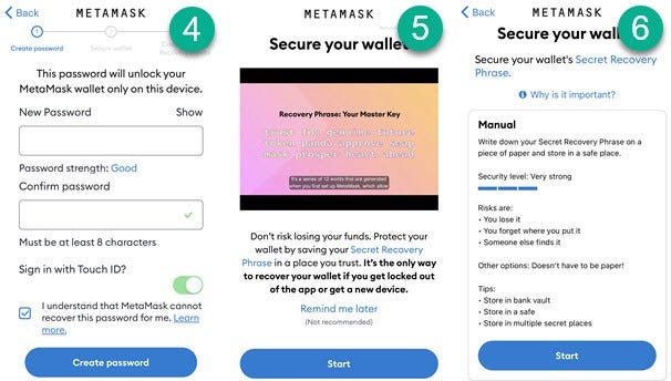 Enter a strong password that will unlock the MetaMask wallet specifically to your mobile device. I left Touch ID/Face ID on and just use my finger print to access the wallet. The next steps are advice on securing your MetaMask wallet. I cannot stress how important this is!