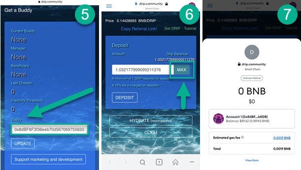 (You can click the “Buddy Detected” button if you use the link above to get there.)Then scroll back up to Deposit and deposit at least 1 DRIP (Ensure you have enough BNB left over to pay for the gas fees ~.01 to get started)