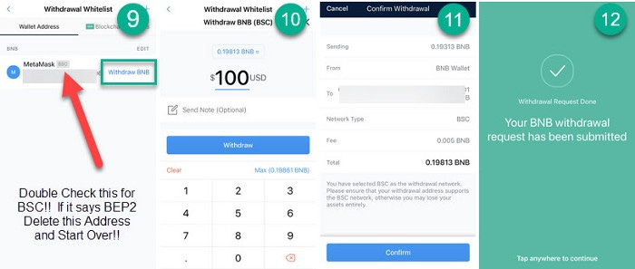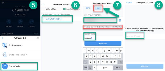 Step 7 is pretty important so pay attention! Make sure to change the light blue selection at the top to BSC (Binance Smart Chain). Then paste (from Step 1) your MetaMask wallet Address into the Wallet Address field. Read carefully… in the 2nd red box — “Sending to a non-BNB wallet will result in lost funds.” And finally in Step 7 give this Wallet a name. I used MetaMask.