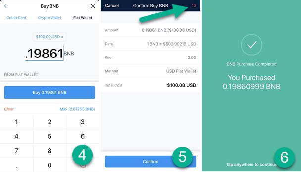You’ll want to determine the price of the cryptocurrency you are looking to purchase as noted above in comparison to your fiat equivalent. In the example, .19861 BNB is $100 USD (And at the time of this article that is more than enough to join the DRIP Network!). Note the arrow pointing to a small red number in step 5. That is a countdown timer. Once you get to this step, you’ll need to review and confirm the transaction fairly quickly.