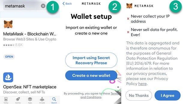 Search for metamask on your mobile device and download the MetaMask app. Then you can Create a New Wallet. After reviewing the initial MetaMask conditions, click I Agree if you choose to continue.