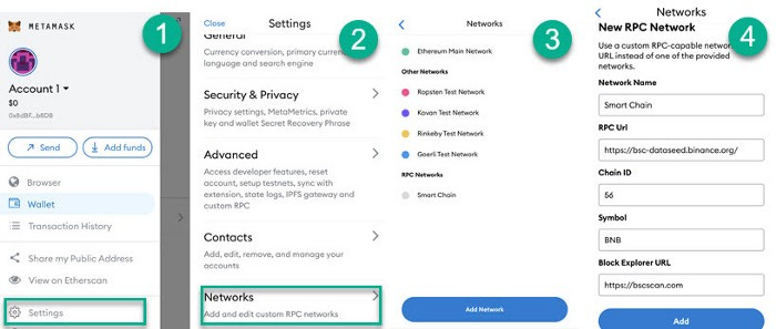 Click the hamburger icon (three lines) in the upper left hand corner of the MetaMask app to access the side-menu. Then select “Settings” — “Networks” — “Add Network”. Add the New RPC Network information as follows: