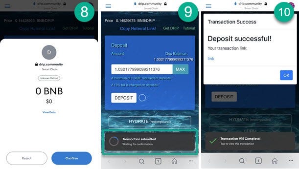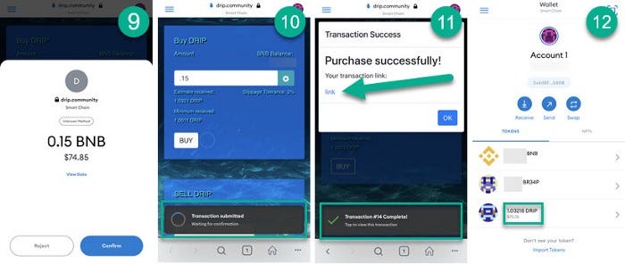 Scroll the confirmation pop up down to see the Confirm Button. Then you’ll see the Transaction in process and eventually the Transaction Success! Notice the arrow in image 11 pointing to the “link”. This takes you directly to the transaction on the Binance Smart Chain Explorer. And voilà! You now have successfully purchased DRIP and it can be viewed in your MetaMask wallet!