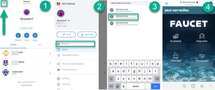 You should already be in the MetaMask Browser where you can navigate to the DRIP Faucet. If not, go to your MetaMask wallet and open the side menu to view the DRIP page in the browser. You’ll want to go to https://drip.community/faucet.
