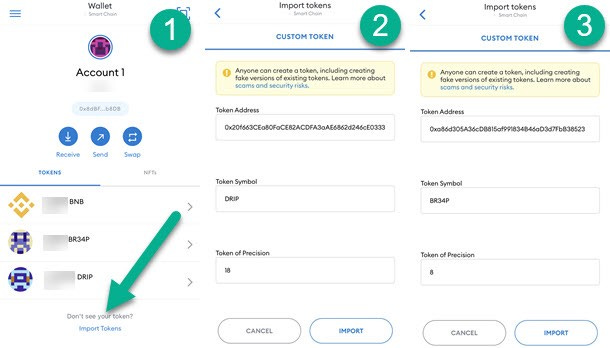 From the main MetaMask screen (Make sure you’re in your Smart Chain Network), select Import Tokens from the bottom. Then use the token addresses below to import DRIP and BR34P. I recommend copying and pasting the Token Address in, and when you click out of the input field, the Token Symbol and Precision will automatically populate.