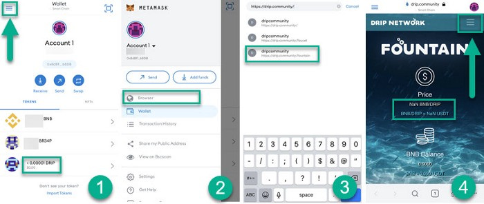 Starting with No DRIP… select the side menu and then switch into the MetaMask Browser. You’ll need to do all of your purchase/sale/swaps from outside web pages via the MetaMask Browser because the wallet will need to be connected to the site. Then go to the Fountain to purchase DRIP — https://drip.community/fountain. Open the Fountain menu to access the Wallet Connection.