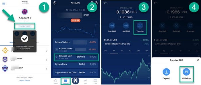 Start in your MetaMask wallet and click your wallet address to copy it to the clipboard. Then from the Crypto.com app, go to the Accounts tab and select Binance Coin. From there you’ll select Transfer and then Withdraw.